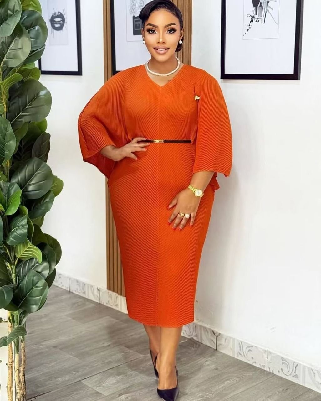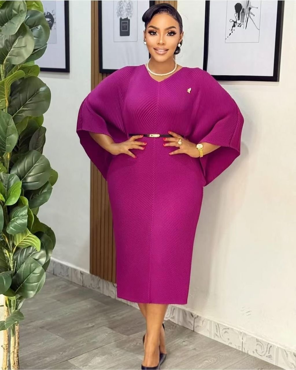 Make a bold statement in this plum-hued midi dress featuring elegant batwing sleeves and a sleek waist belt. A sophisticated choice for office, events, or evening outings—effortless style with modern flair. Available in various colors.