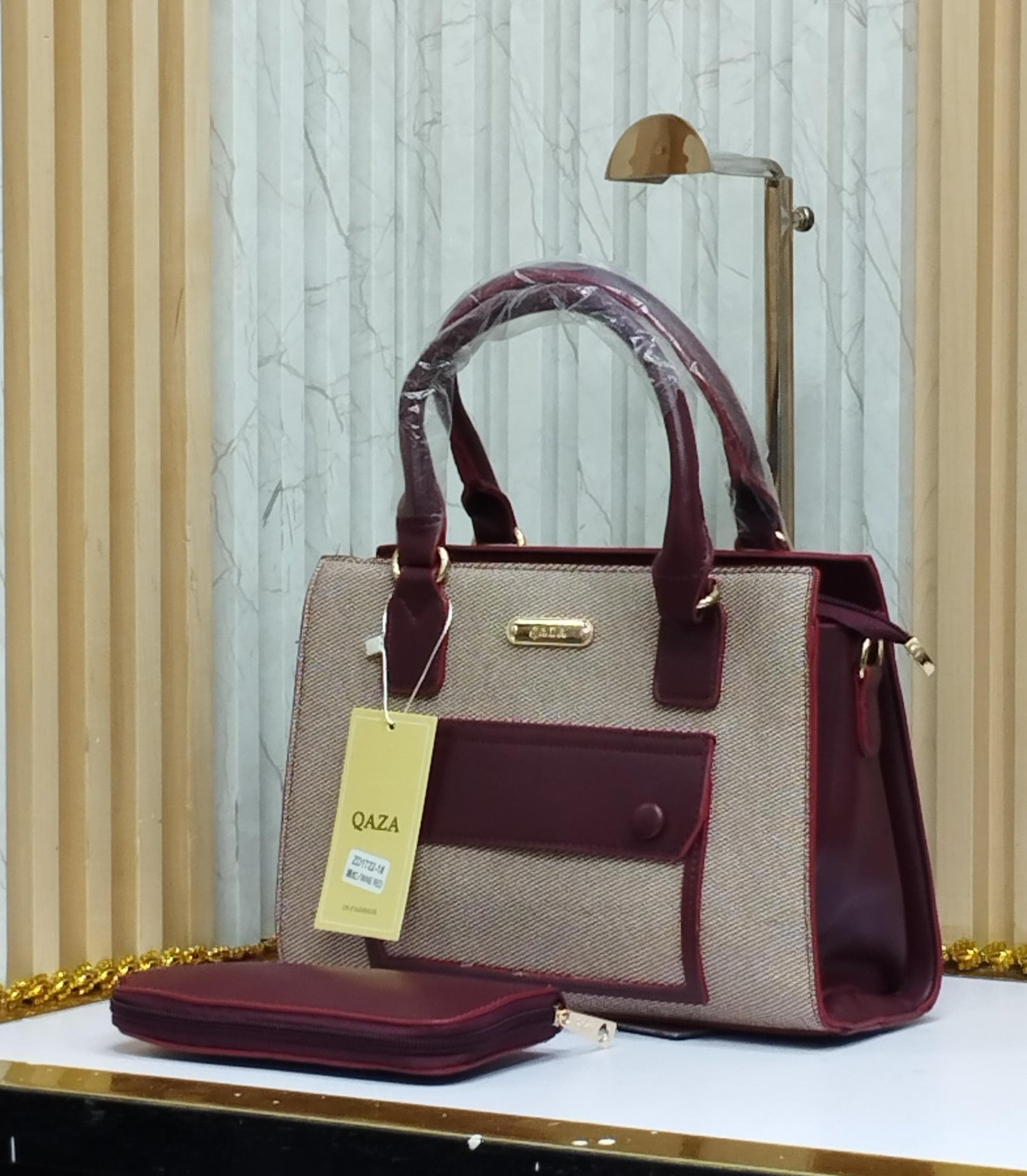 This classy QAZA handbag set adds effortless polish to your everyday style. With a blend of rich wine-colored leather accents and textured cream fabric, it balances elegance with practicality.