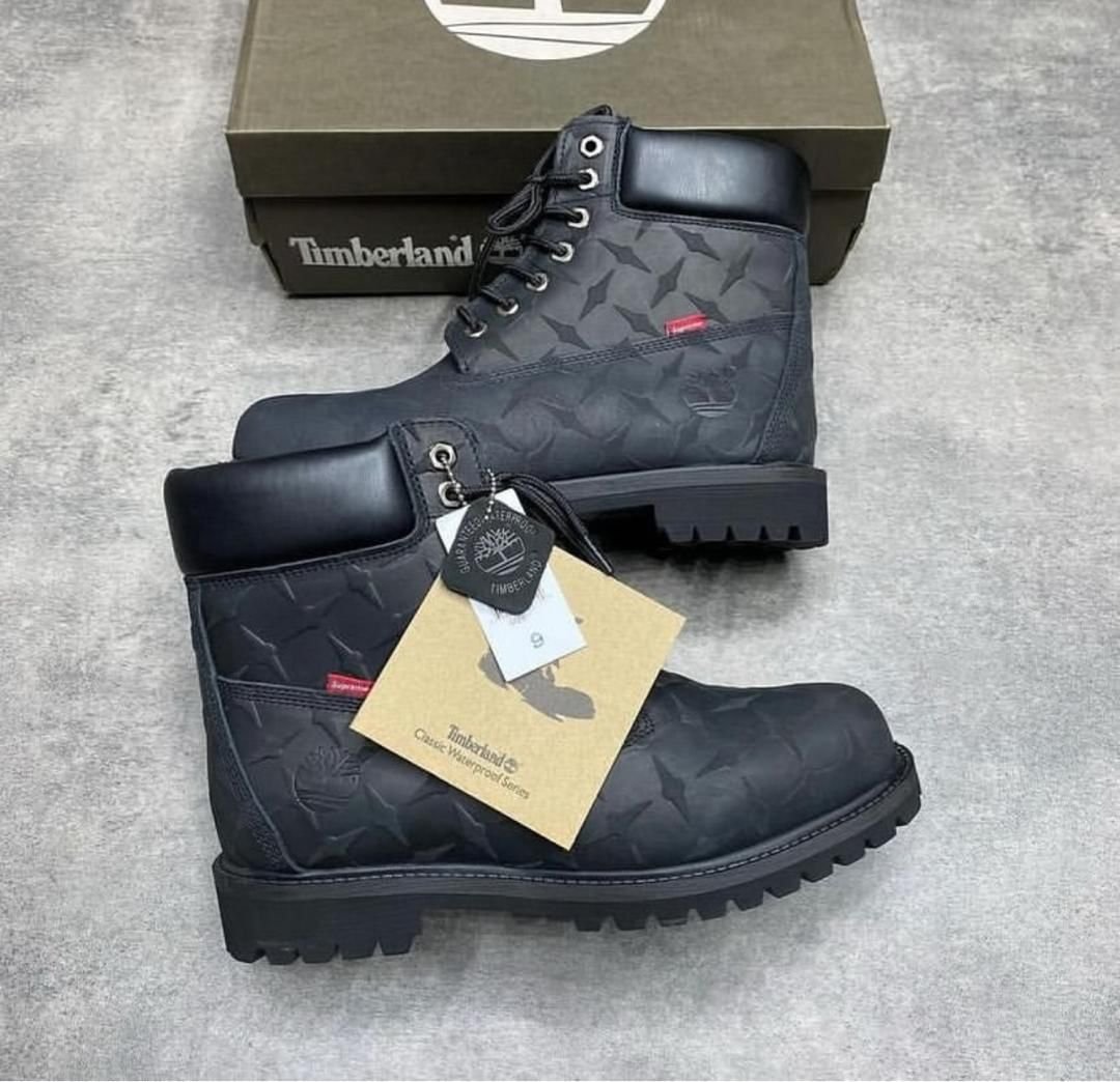 Unleash rugged style with these exclusive grey Supreme x Timberland boots, where streetwear meets outdoor durability. Designed with premium textured leather, bold geometric embossing, and iconic co-branding, these boots are made for those who don’t compromise on style or strength. Featuring a padded collar, metal eyelets, and rugged lug outsole, they’re built for the streets and beyond.