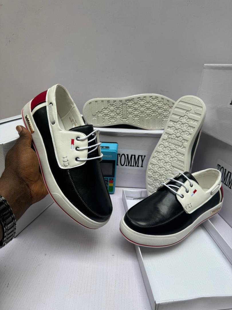 Sail into style with these Tommy-inspired leather boat shoes, designed for effortless class and comfort. Featuring a rich navy leather upper, crisp white detailing, and bold red accents at the heel, these shoes are perfect for both casual and semi-formal looks. The cushioned insole and grippy outsole offer all-day comfort and stability. A must-have for the modern man who values both style and quality craftsmanship.